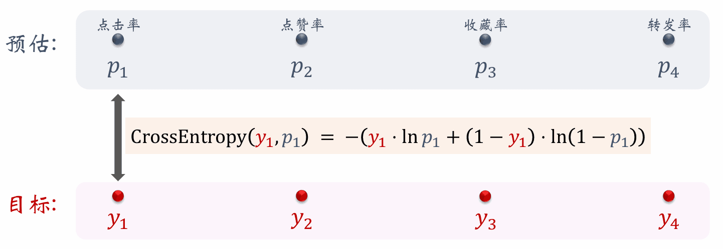 对于点击率来说,模型实际上就是根据点击率来判断一个物品是否为被点击物品。这是一个二元分类问题,因此用交叉熵损失函数。