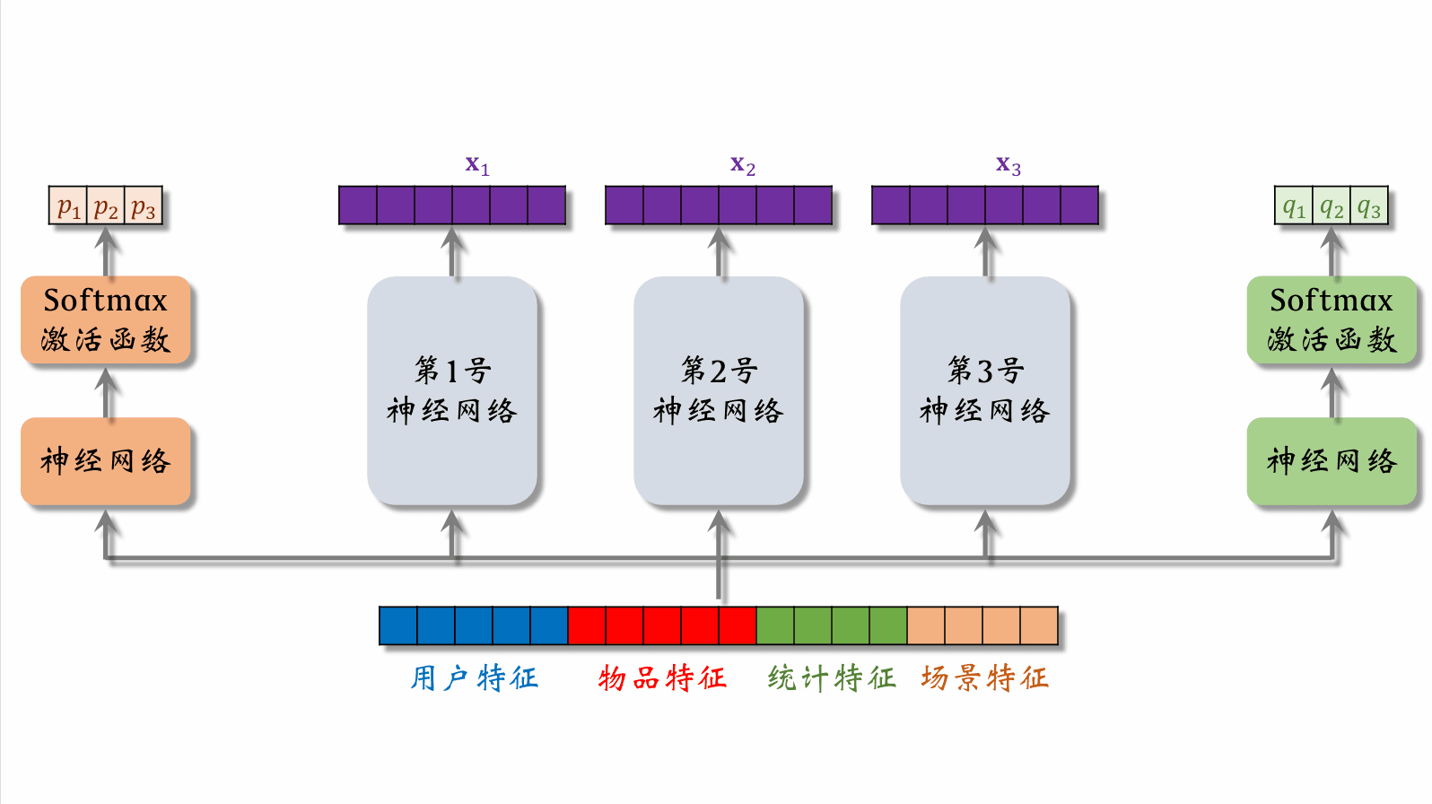 将用户特征,物品特征,统计特征和行为特征输入到左侧的神经网络中,再经过 softmax 激活函数得到一个权重向量,这种神经网络也叫做门控神经网络。向量中的三个值 分别代表着对 的权重值。右侧神经网络同理。